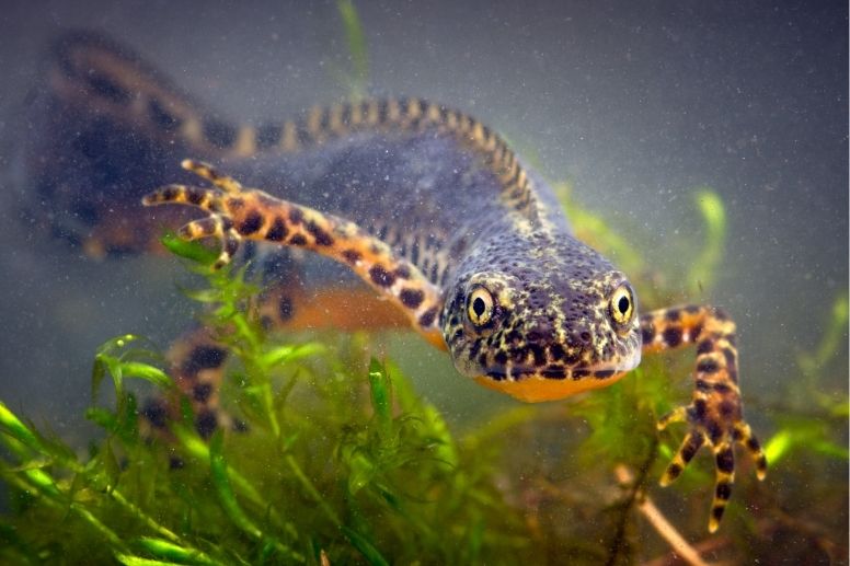 Nördlicher Kammmolch mit gezacktem Rückenkamm und orange gefleckter Bauchseite im Wasser.