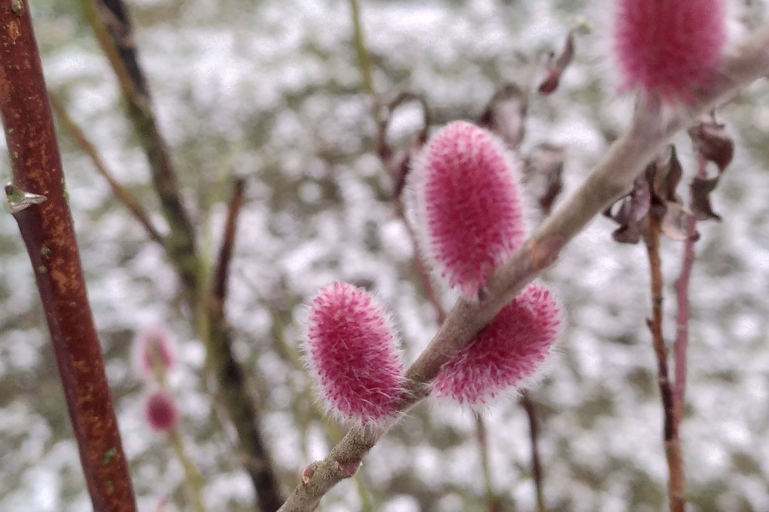 (Salix gracilistyla) der Sorte Mount Aso. Mit ihren intensiv rosafarbenen Kätzchen setzt sie in den Wintermonaten einen neuen Blickfang. Gleichzeitig bietet sie früh fliegenden, auf Pollen angewiesenen Insekten (wie Hummelköniginnen und Mauerbienen) eine wichtige zusätzliche Nahrungsquelle.
