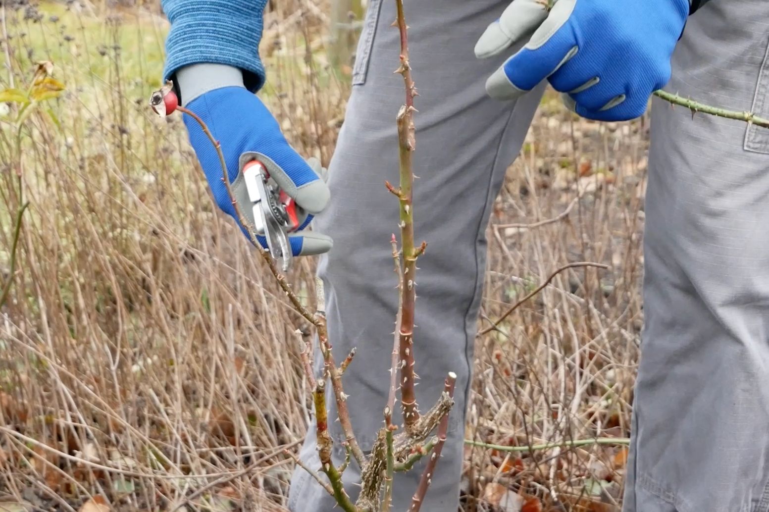 Die Astschere sorgt zudem für etwas Abstand zur Pflanze, hilfreich bei den Stacheln.