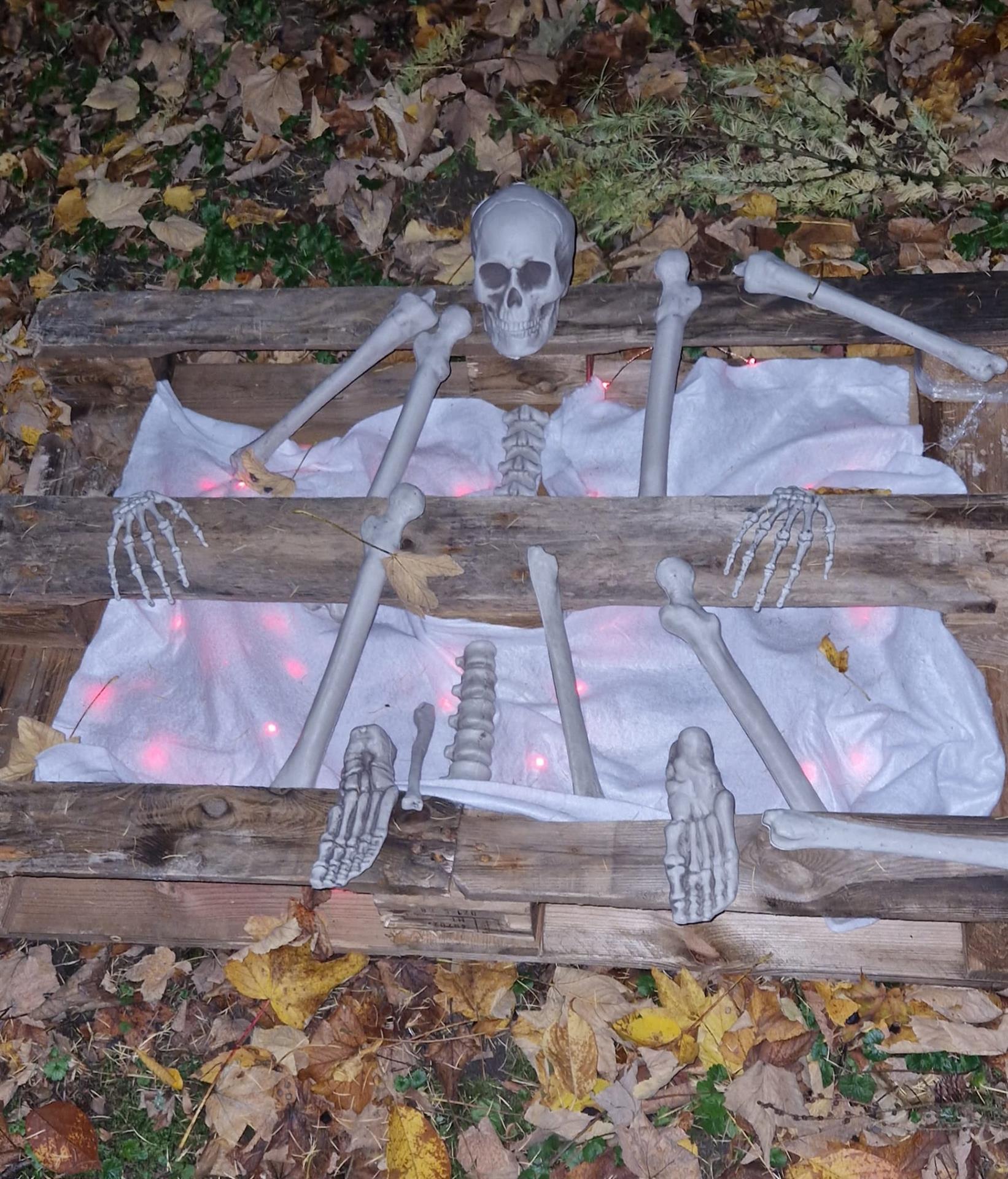 Irgendwo lag ein Skelett. An anderer Stelle saß ein anderes Skelett mit Zylinder und Frack auf einer Bank. Gartenmitglieder in Verkleidung einer Hexe oder eines Gespenstes tauchten urplötzlich im Halbdunkel auf, um ein „Huhu“ zu flüstern. Oder sie standen plötzlich neben den Besuchern.