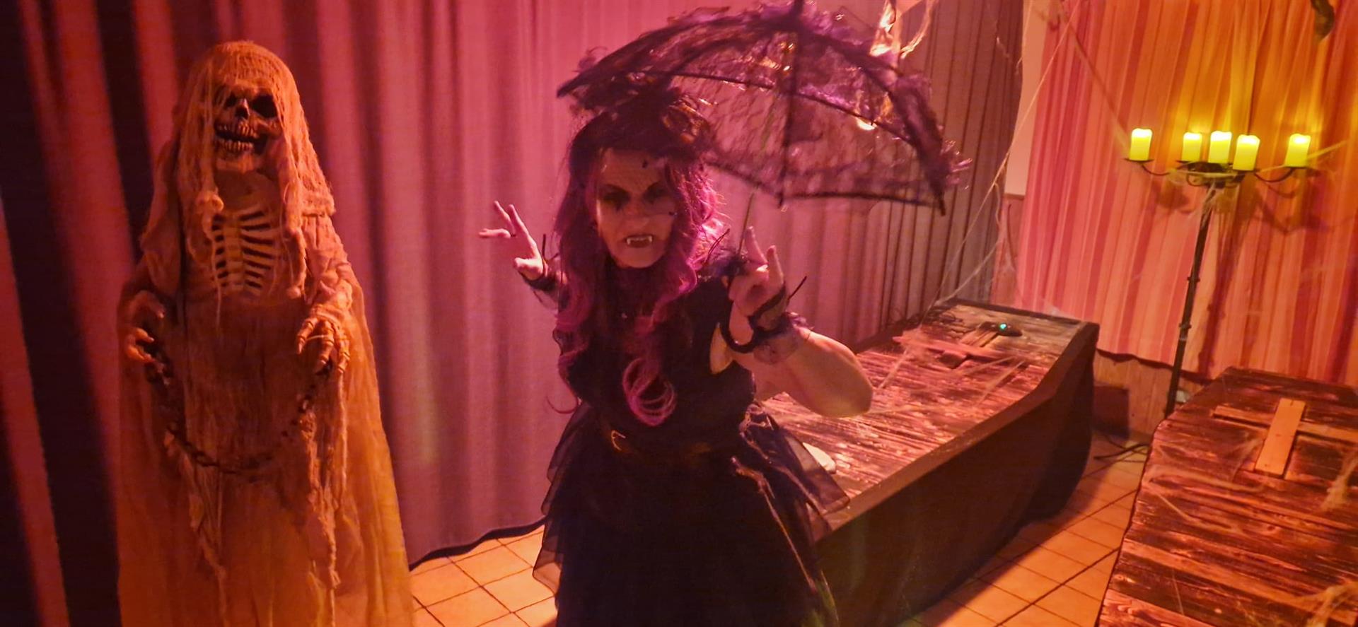 Im Vereinsheim hingen schwarze Vorhänge an den Fenstern herunter, die Tischdekoration war düster. Sogar zwei Särge waren dort aufgebaut. Sie wurden von einem Monster und einer Hexe bewacht. So konnte Graf Dracula ruhen.