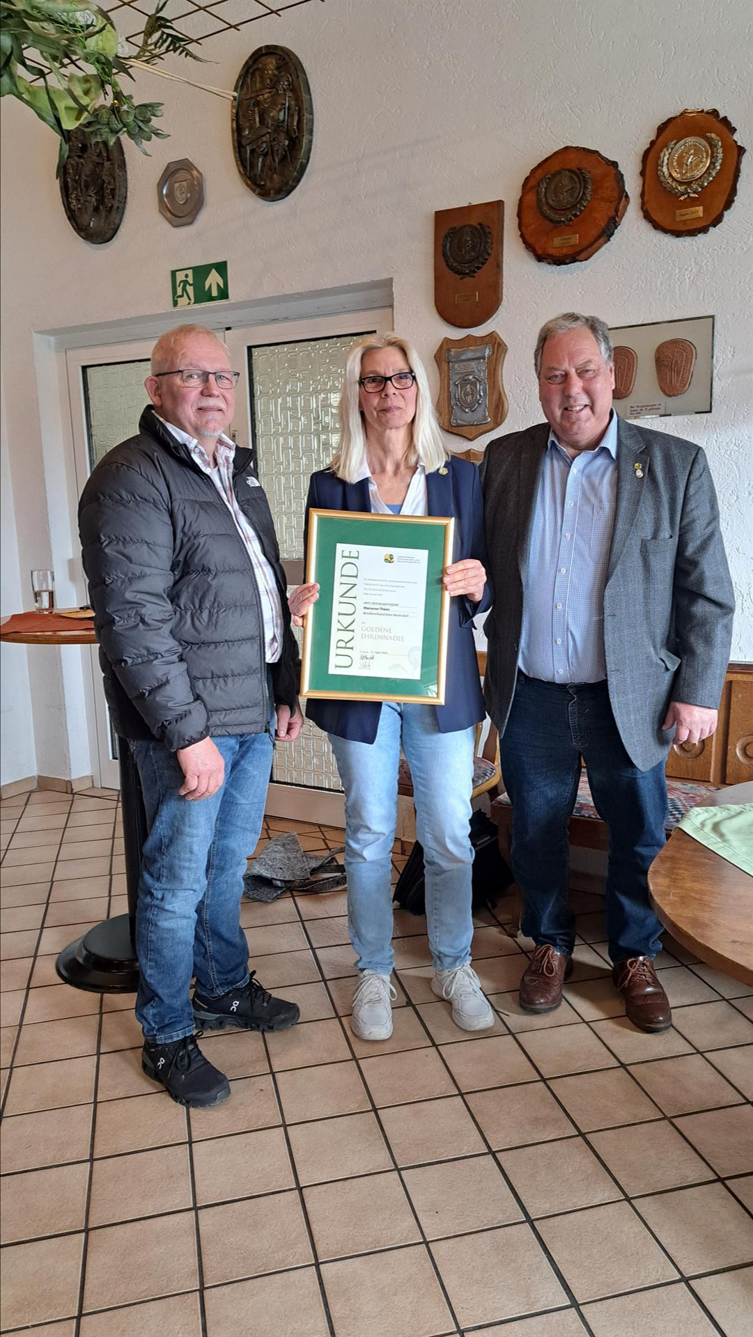 Eine besondere Ehrung erhielt die Schriftführerin des Verbandes, Marianne Thöne. In einer ausführlichen Laudatio des Vorsitzenden würdigte Rosendahl ihre Verdienste und zeichnete sie mit der „Goldenen Ehrennadel“ des Landesverbandes aus. Dem schlossen sich die Delegierten mit großem Beifall an.